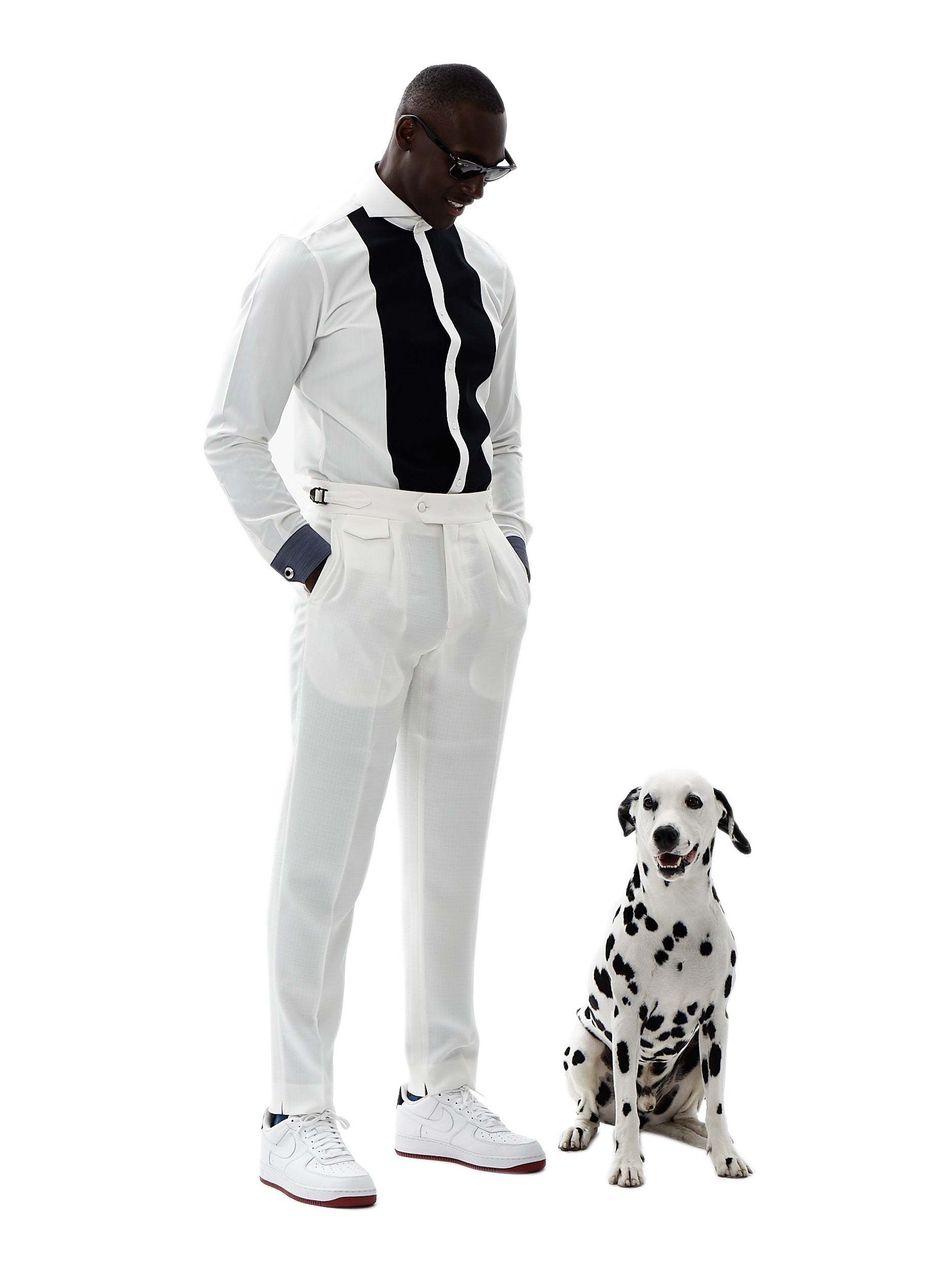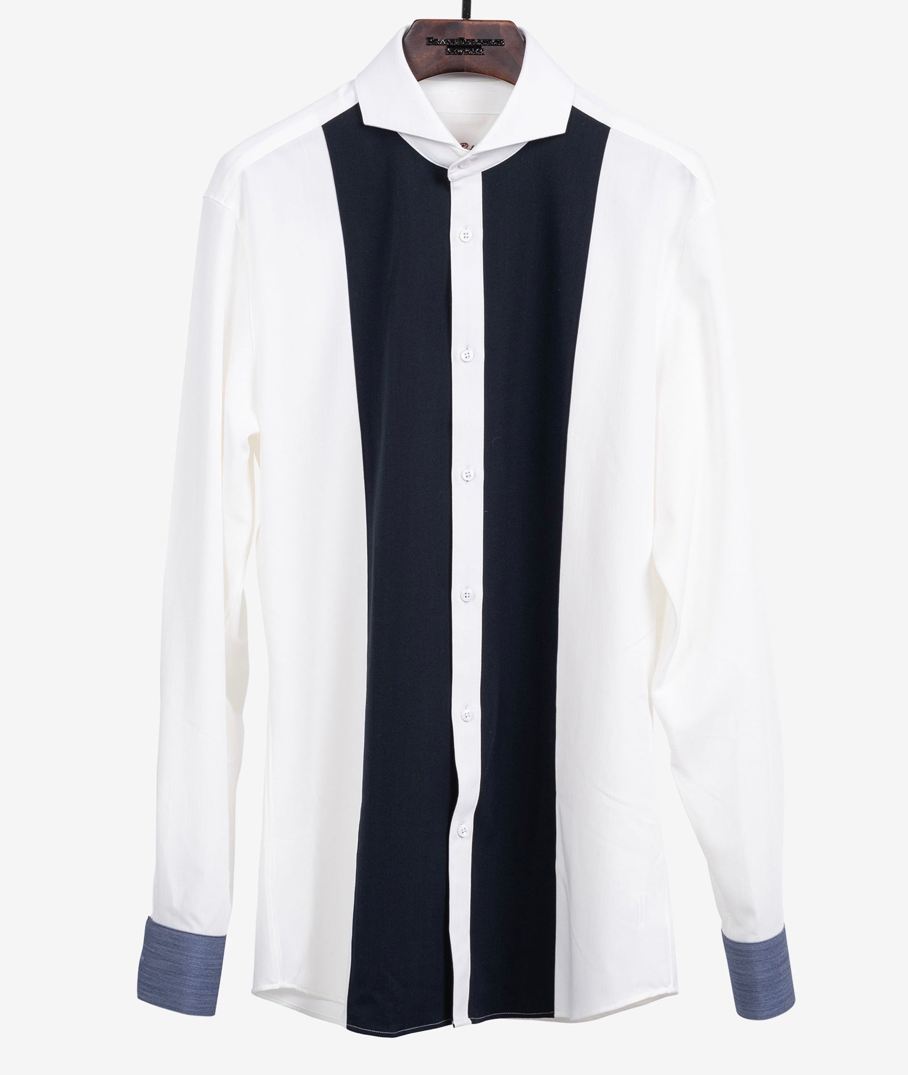 Cutaway Collar contrast, Long sleeves, Two black panels, French single hexagon cuff with two buttonholes, Hidden Placket Style button roll outward and knot, gray-blue cuff inside of cuffs contrast black.