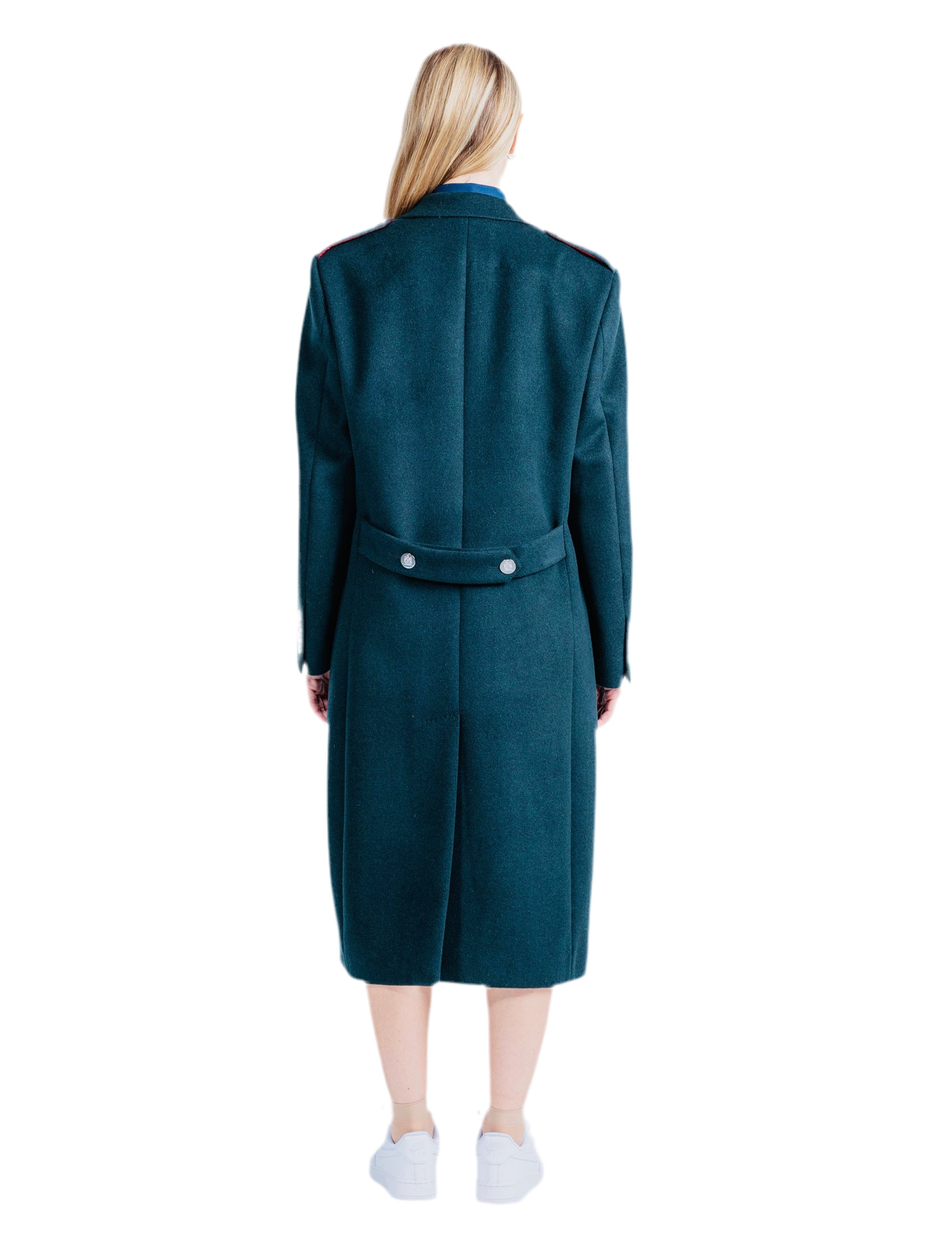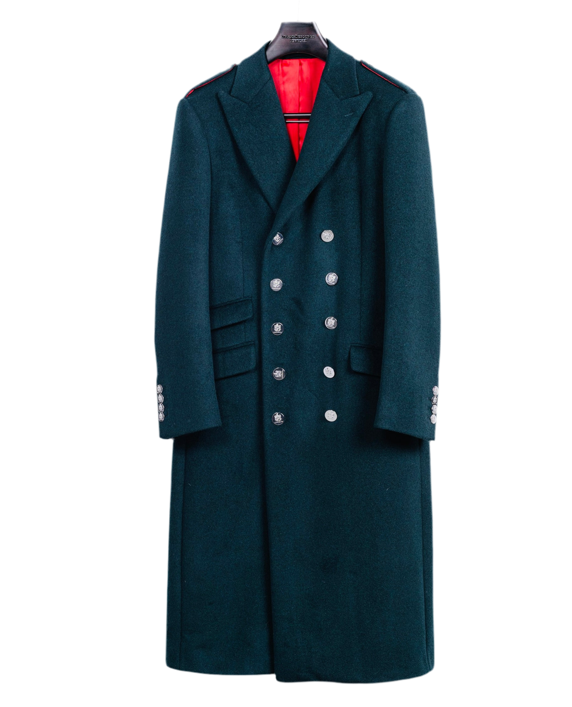 Cooper Great Coat, Forest Green Double Breasted ten buttons with Five buttons Fasten, Structure shoulders Peak Lapel, Central Vent, Real slit, real buttonholes, FD engraved crest buttons
