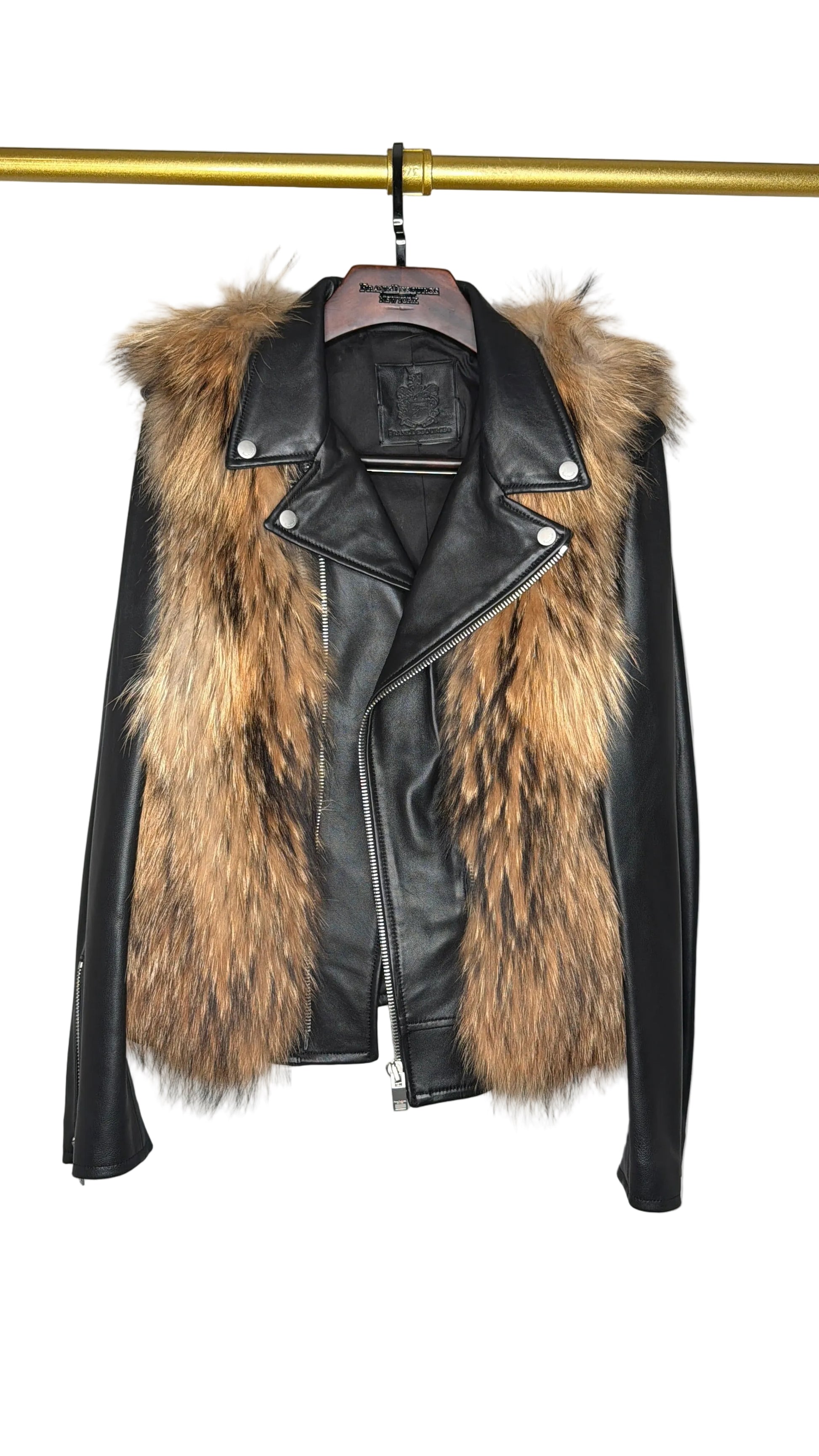 Crafted from supple black lamb leather, this biker jacket is detailed with gleaming Frank Debourge silver studs and hardware. It ages into a unique patina while retaining its sharp silhouette. The included detachable faux fur vest adds a layer of customizable luxury.-Off-center front zipper