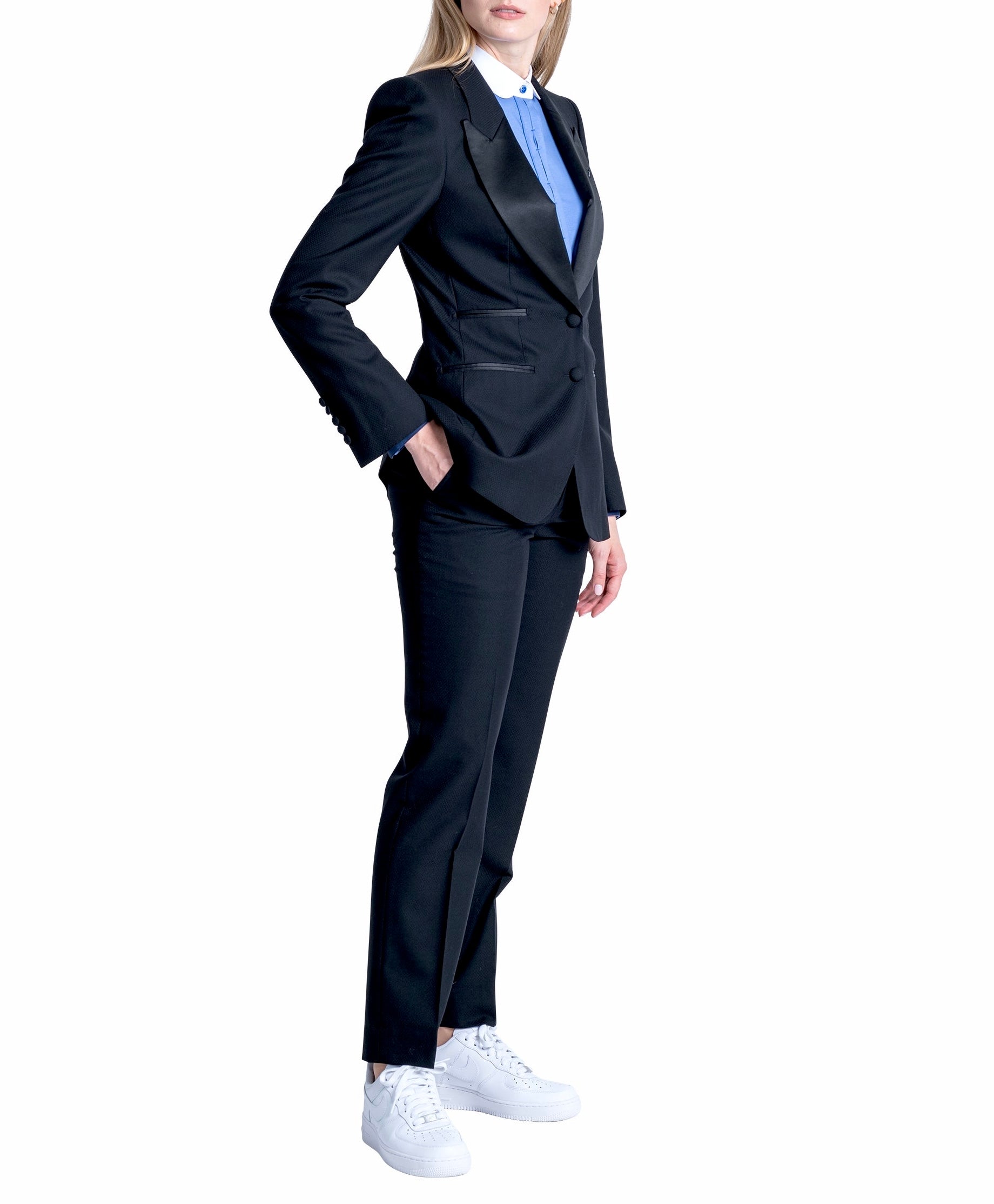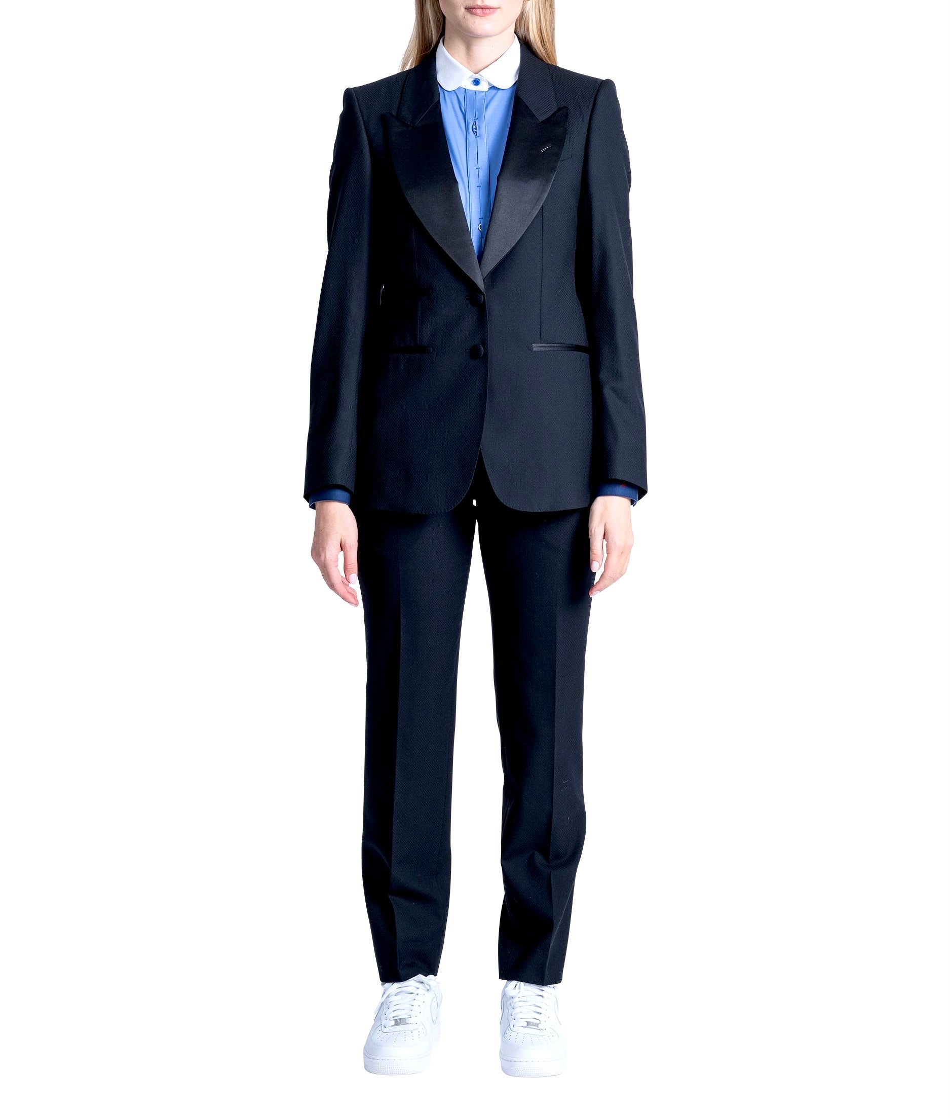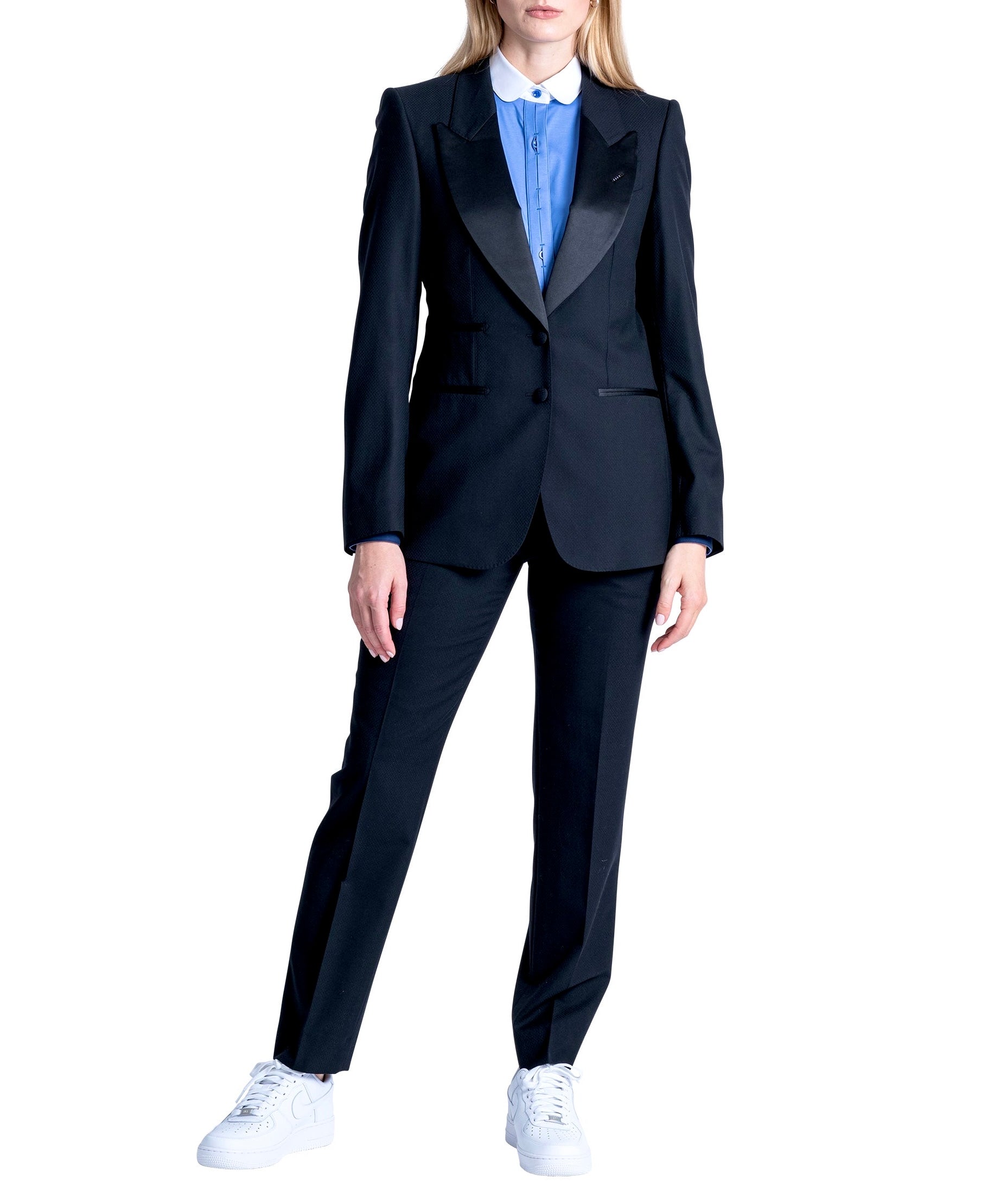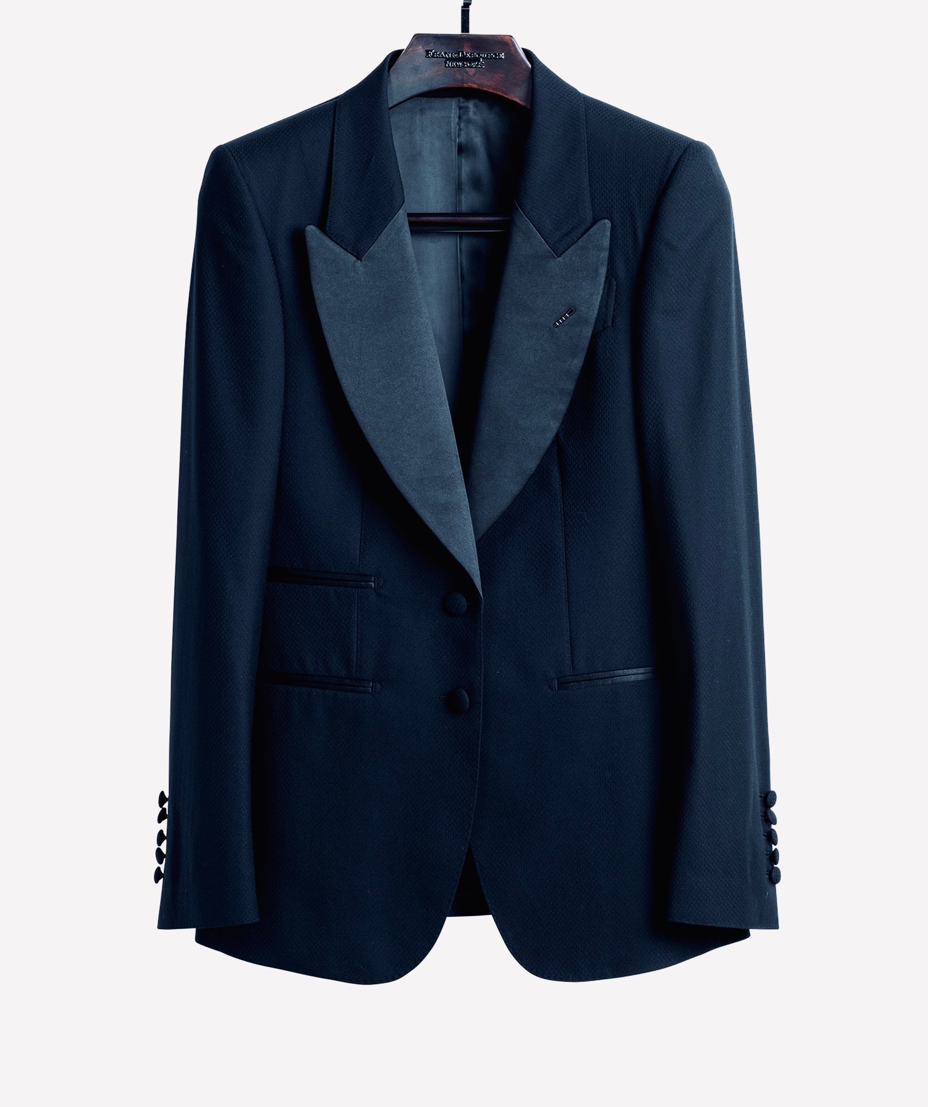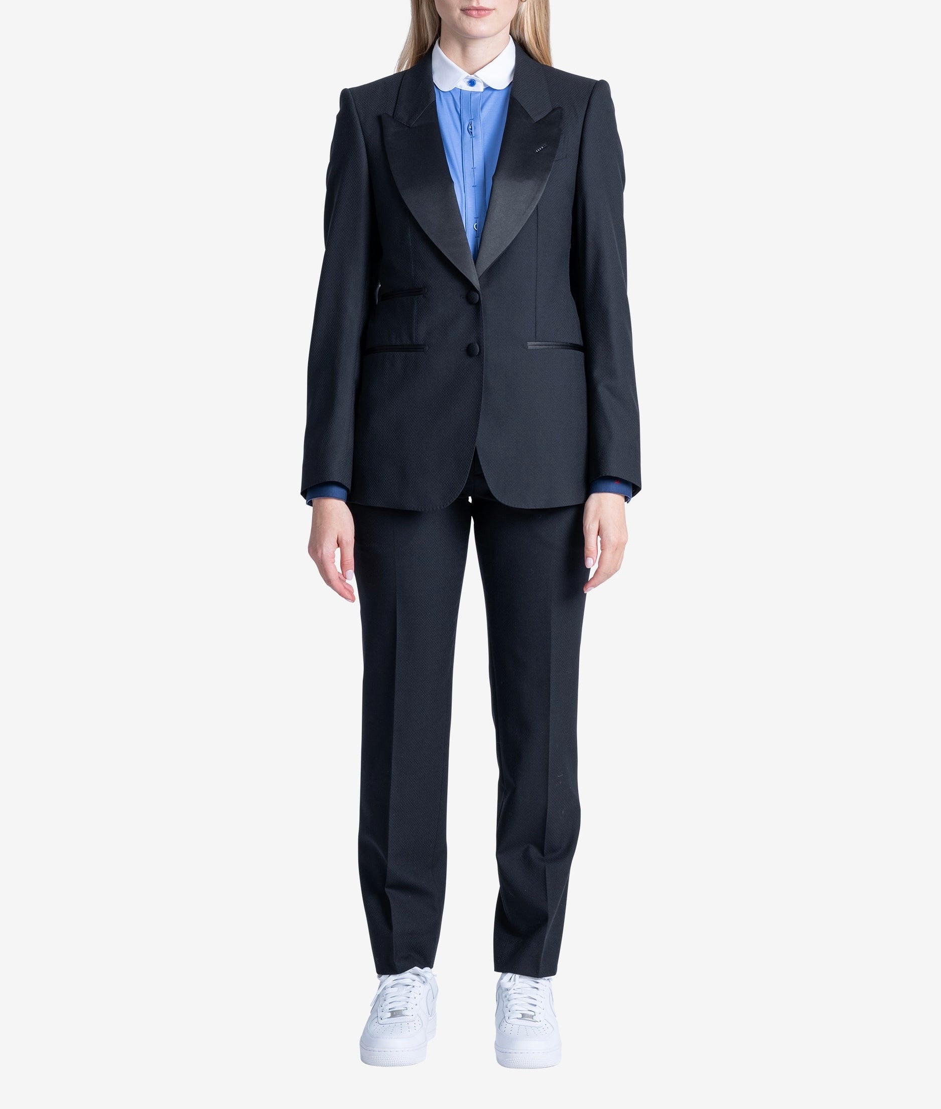 Le Smoking Single breasted, 2 buttons, structure shoulders, broad peak lapel.