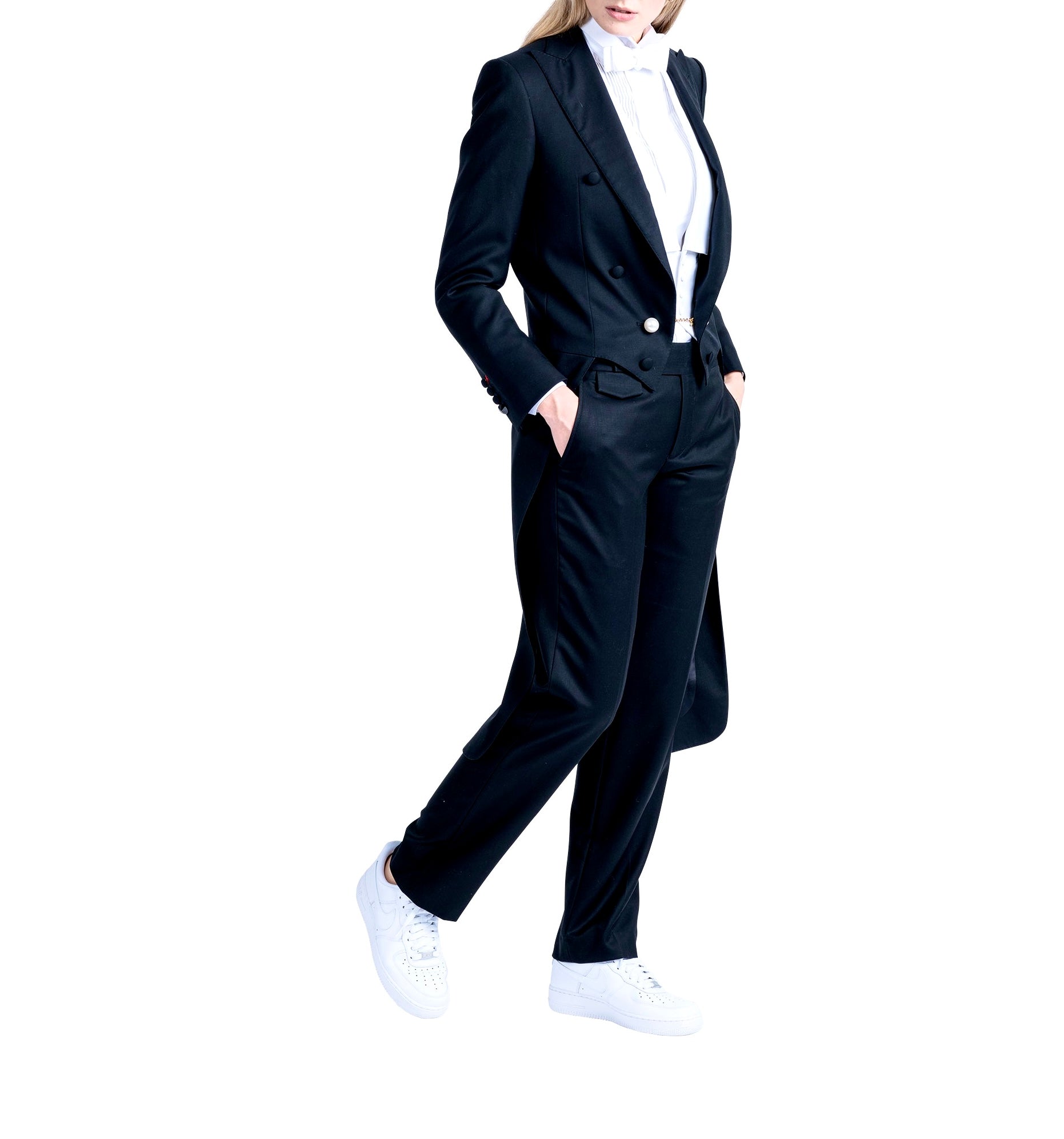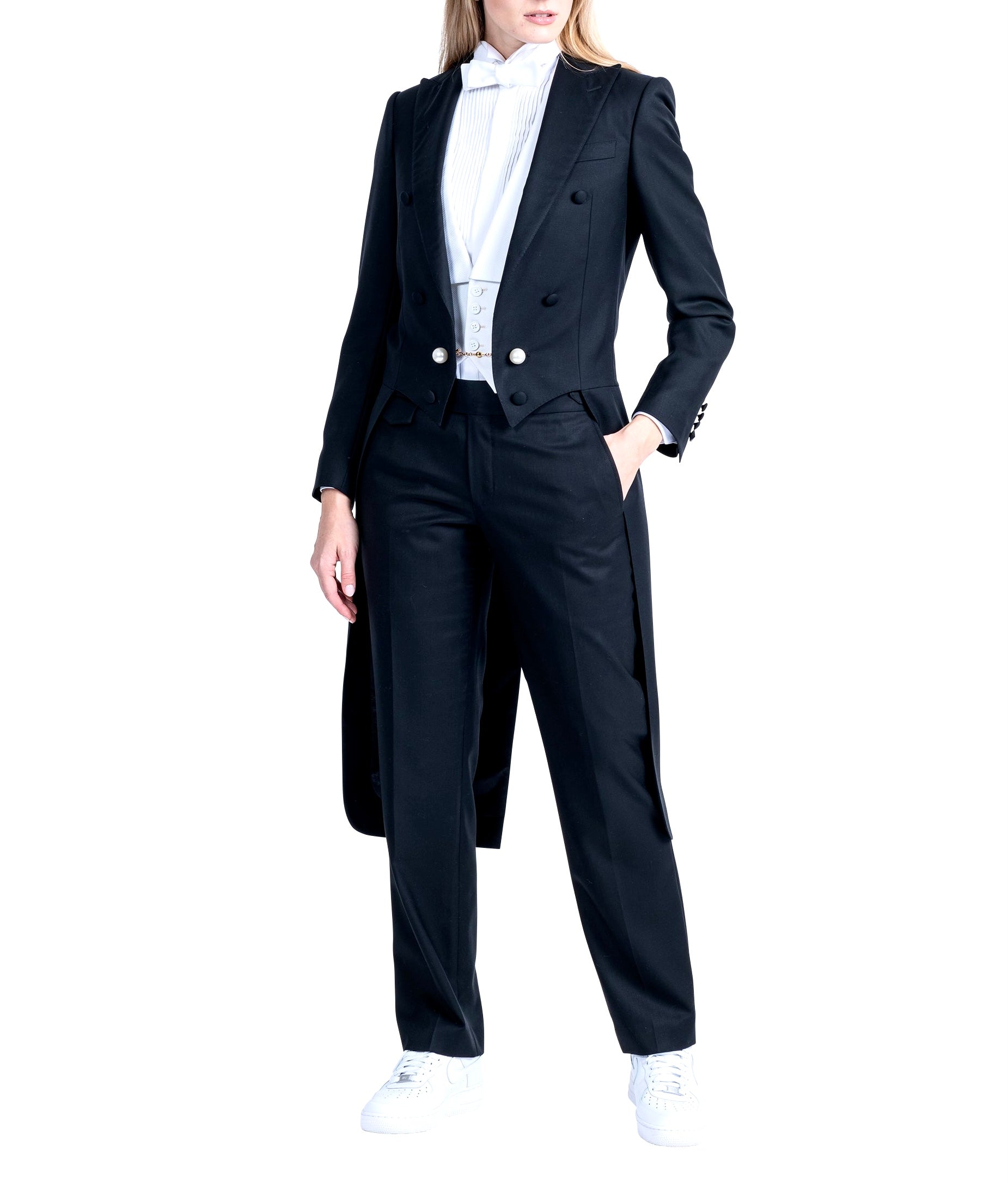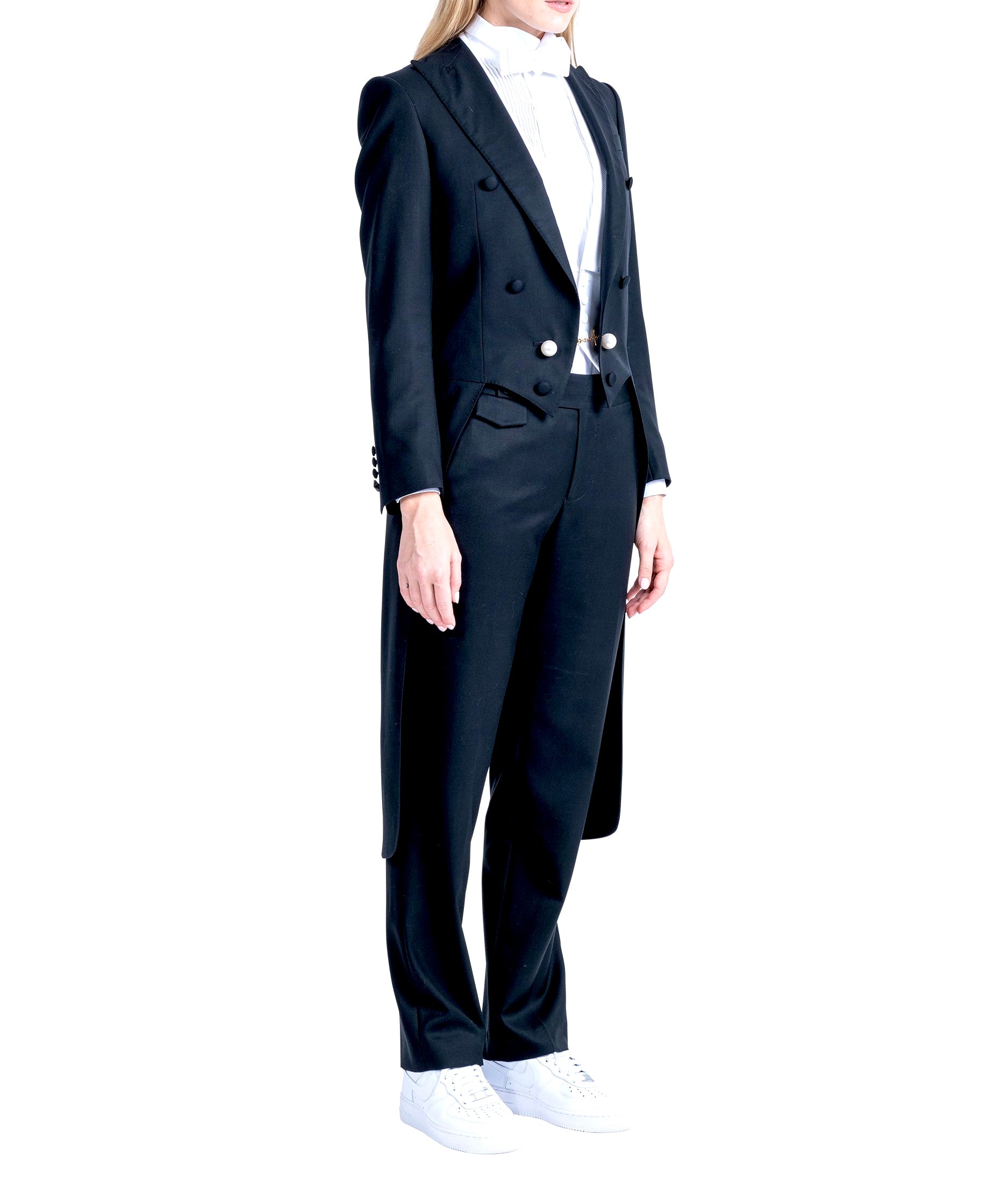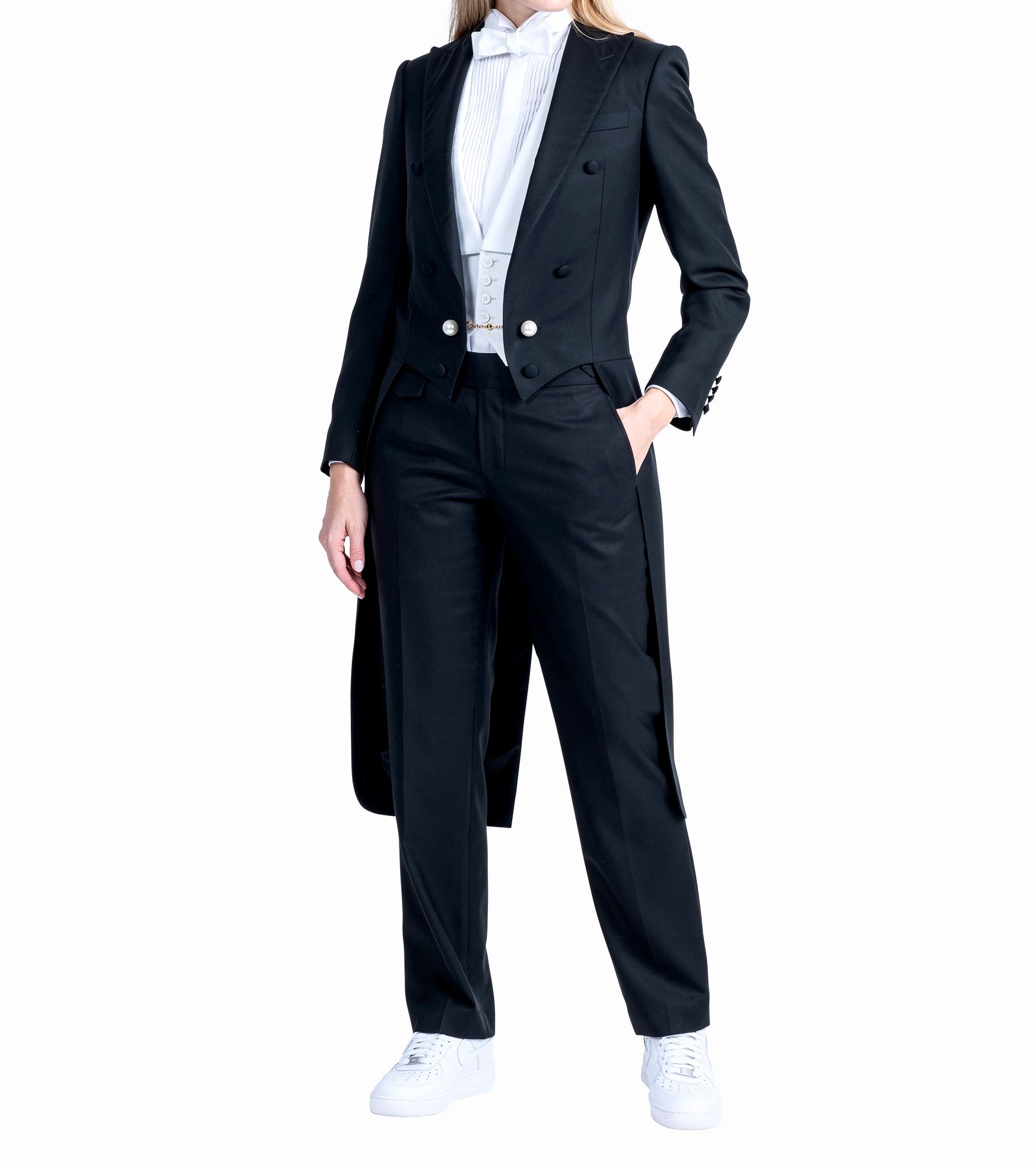 The Redingote: a masterpiece of sartorial elegance. With its wide peak lapels and silk satin detailing, this jacket exudes luxury. Six front buttons and functional sleeves buttonhole, adorned with pearl button balls connected by a gold magnet chain. It is a symbol of refined craftsmanship.