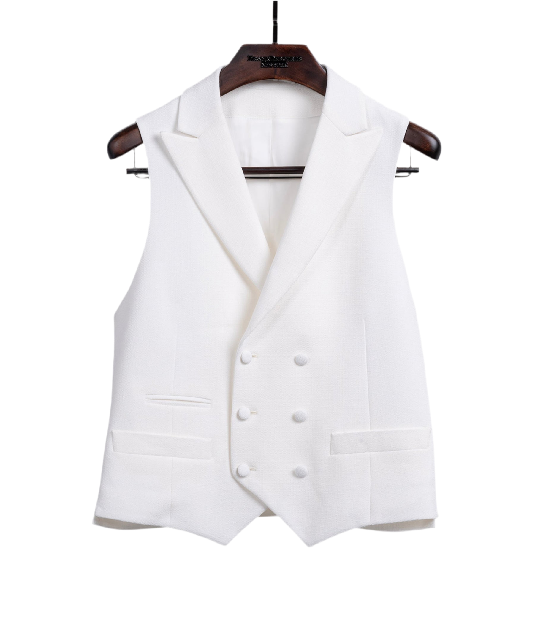 The Molokai Double-breasted Vest, 6 buttons with 3 fasten, Peak lapel with collar band, double besom ticket pockets, Fabric back with Cover buttons.