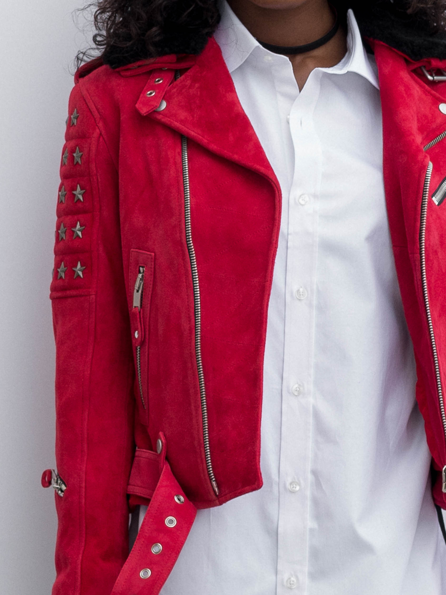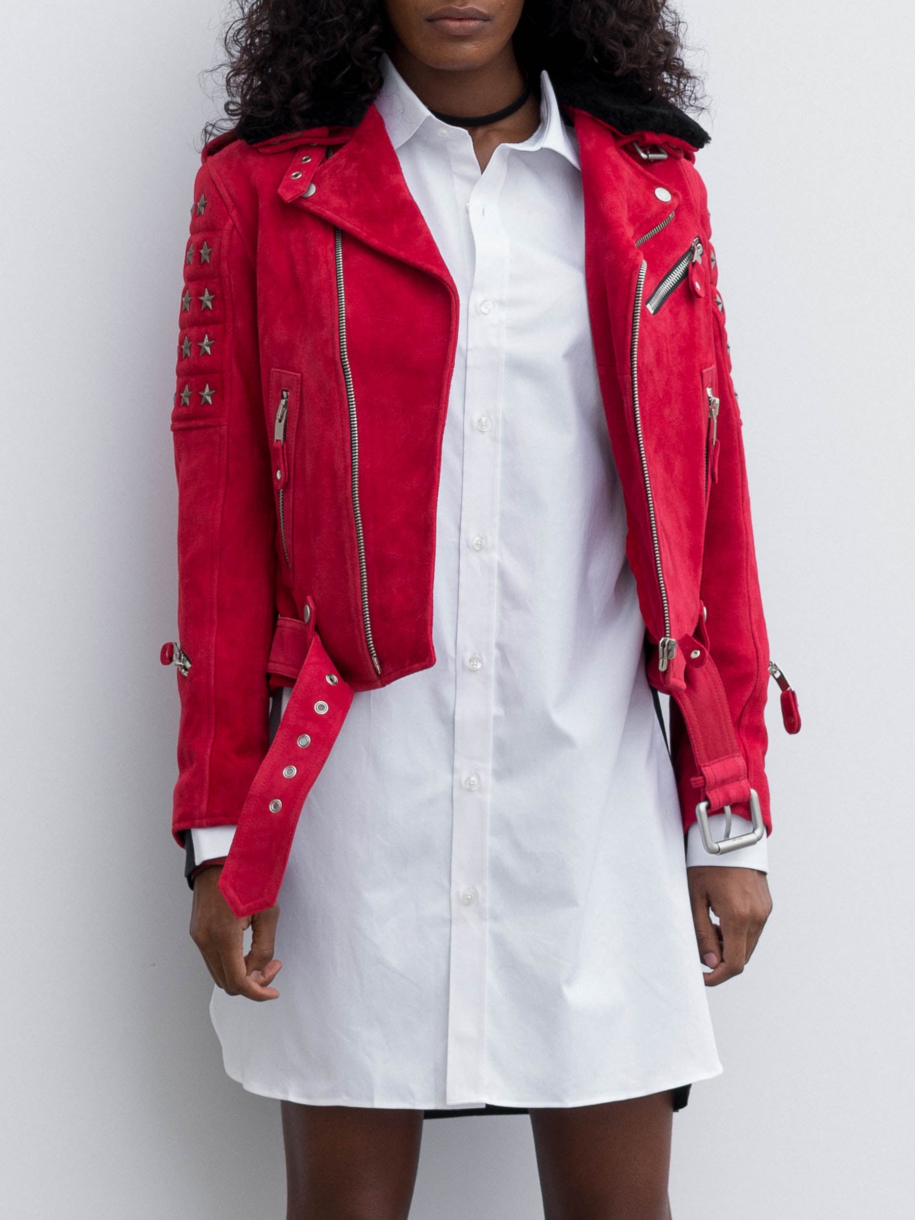 Red Suede Biker Jacket with Detachable Black Shearling Collar - Women
