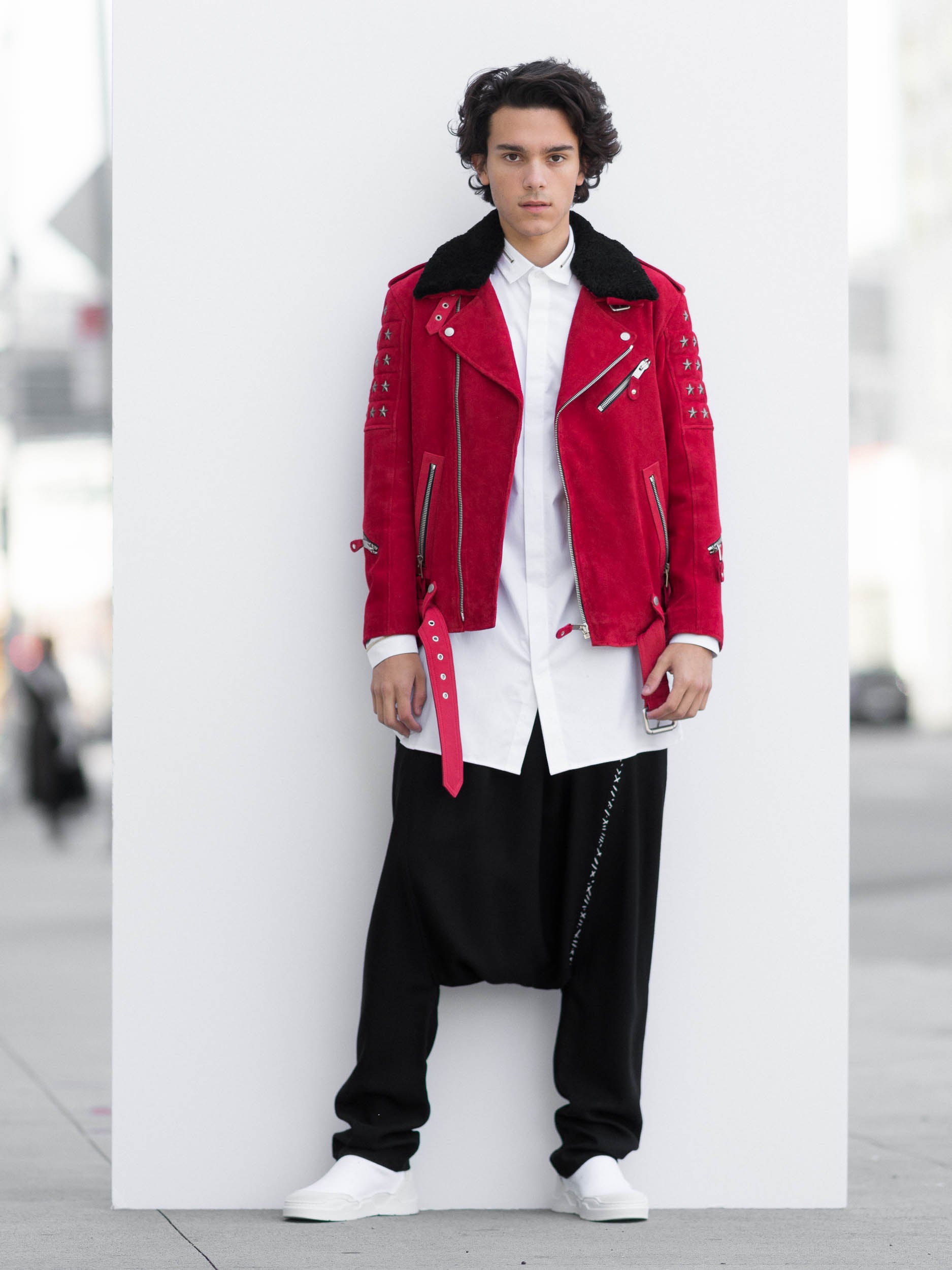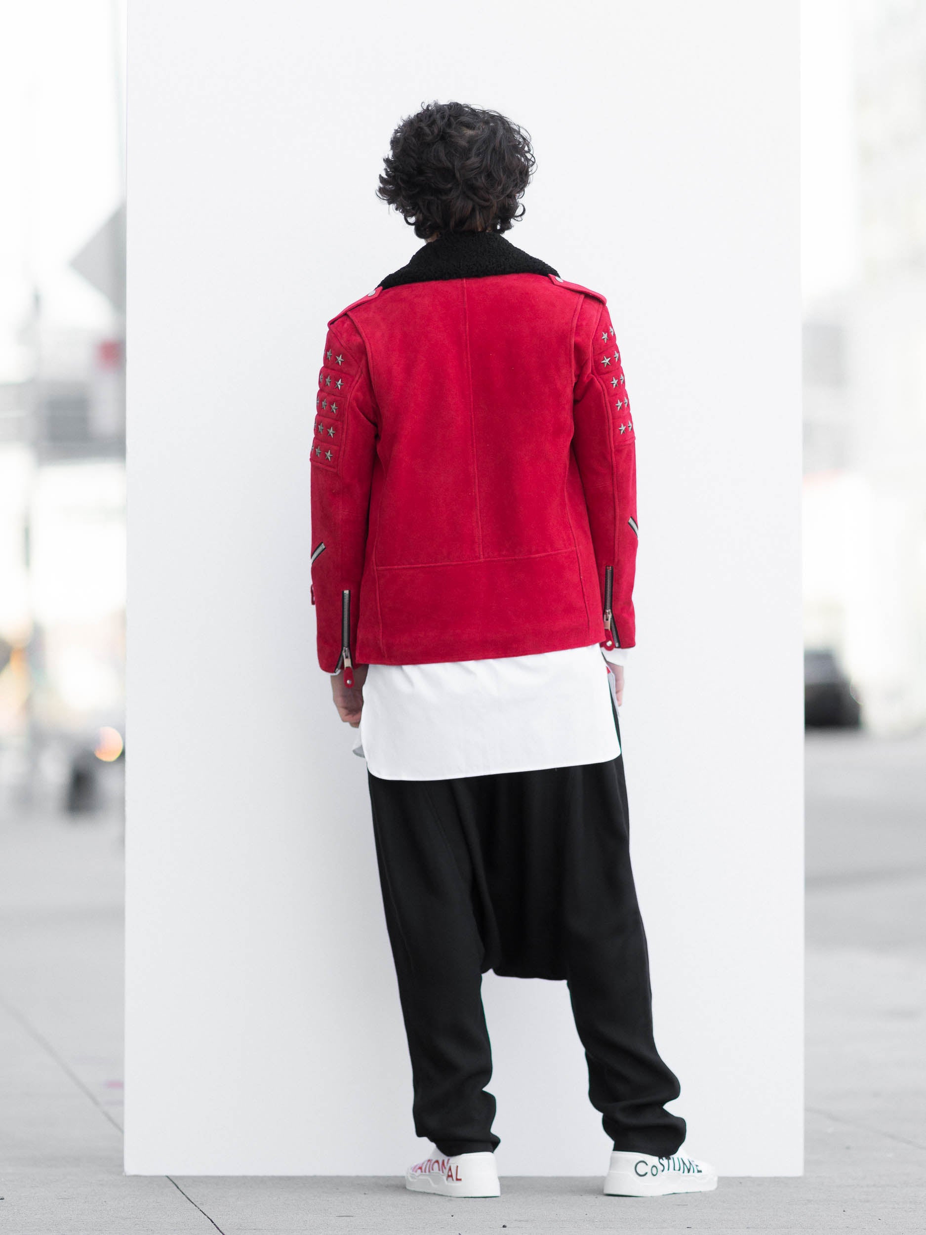 Red Suede Biker Jacket with Detachable Black Shearling Collar - Men