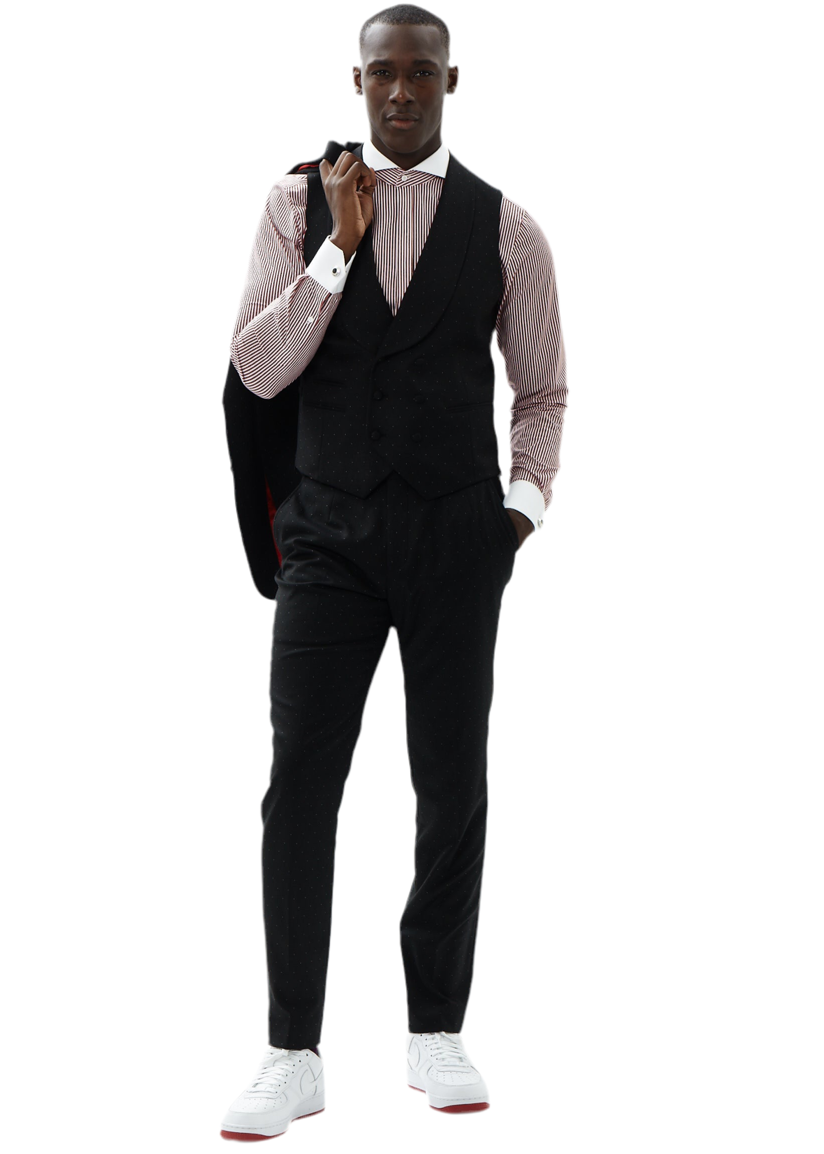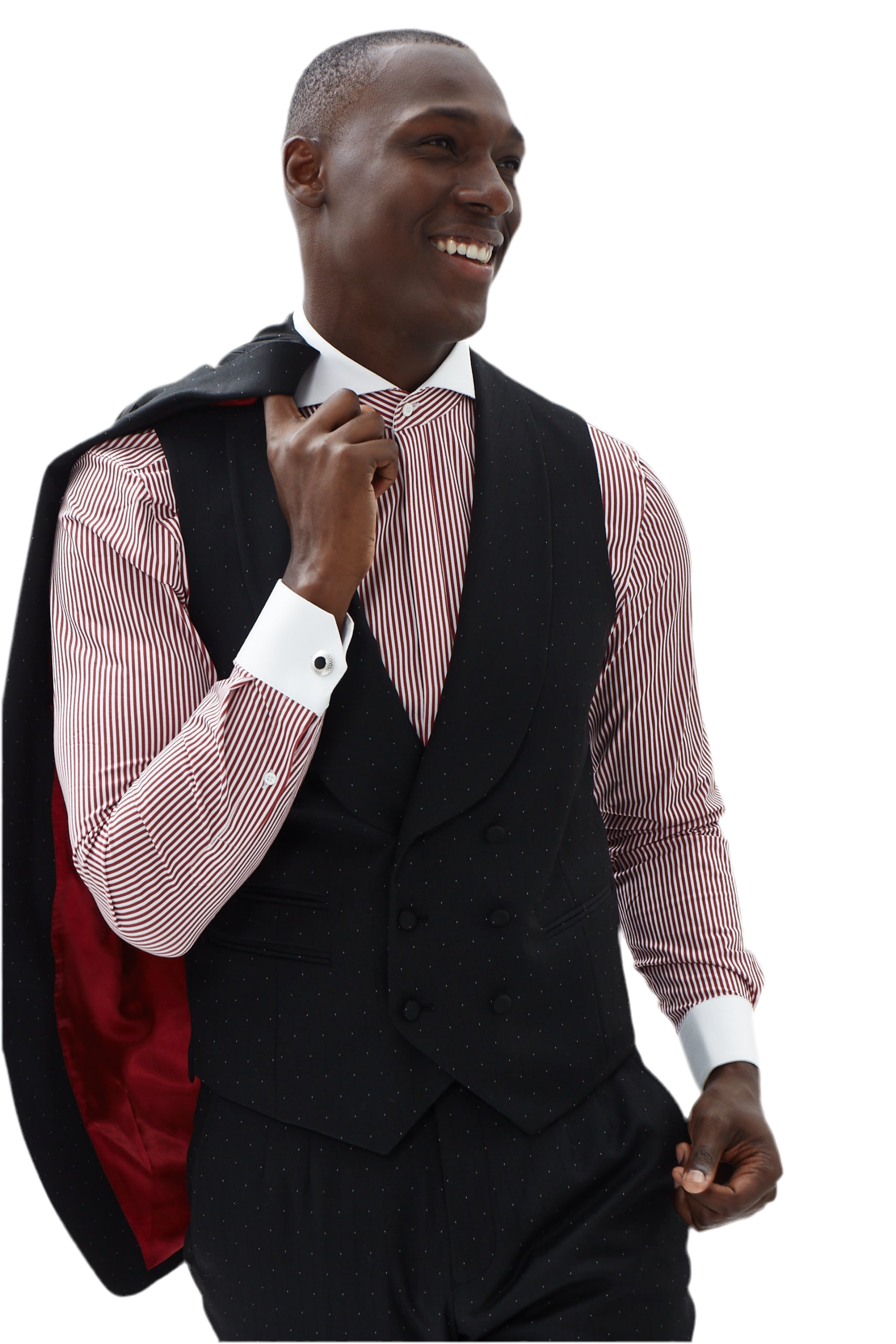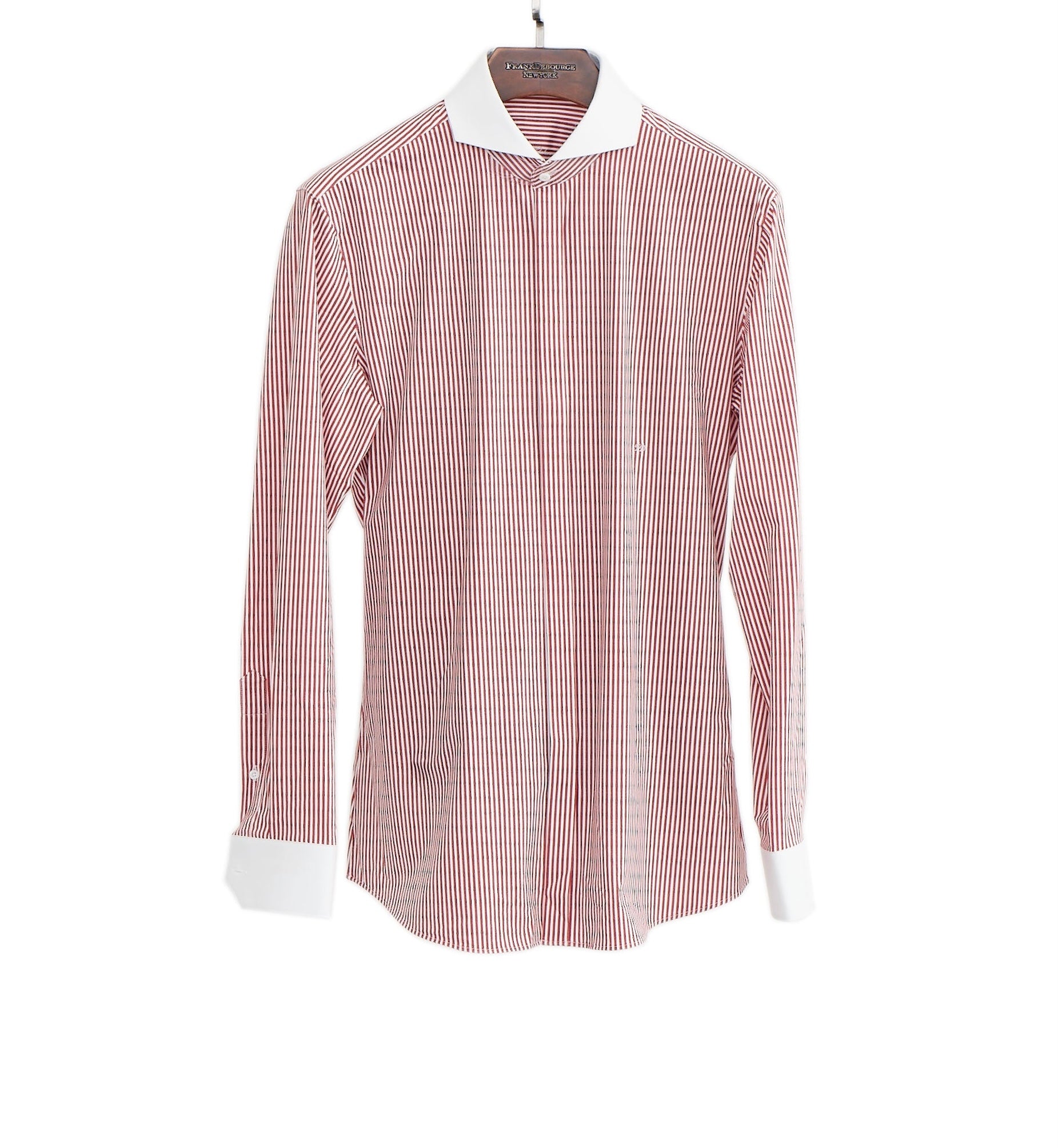 Red pinstripe, White Collar and Cuff contrast , Long sleeves French single hexagon cuff with two buttonholes, Placket style, Hidden button roll outward and knot, Stretchy Fabric, Cutaway Collar