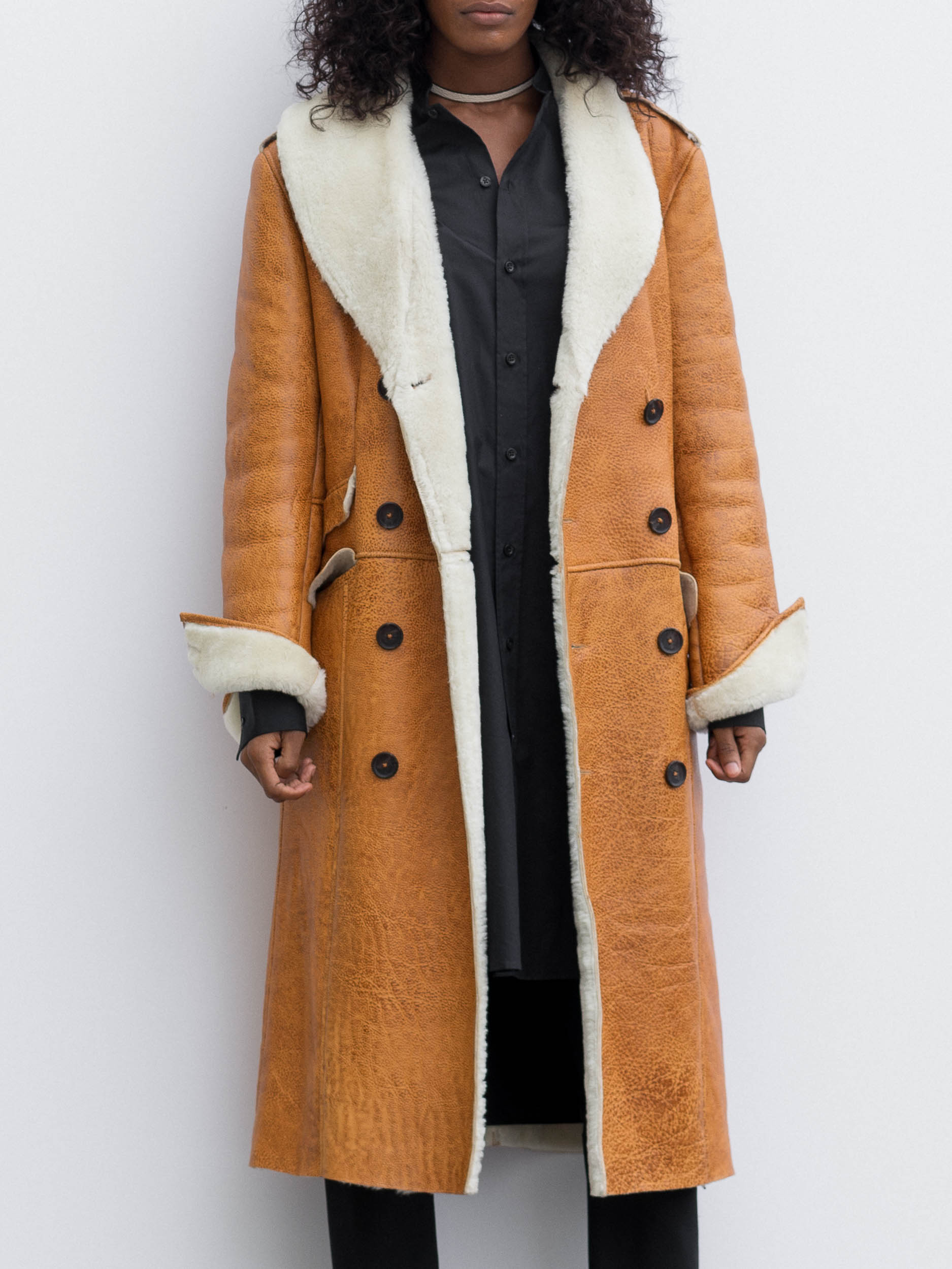 Stay warm in style with our medium-weight shearling coat, made with buttery-soft camel leather, and double-breasted front closure for added comfort, and warmth the cold winter season.